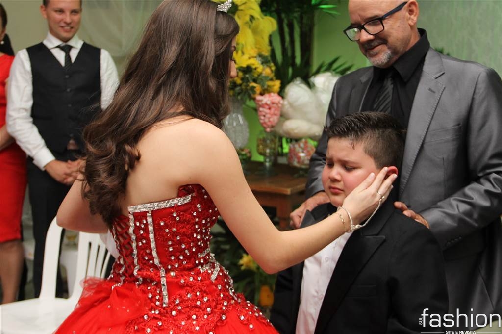 Noite inesquecível e mágica para a doce aniversariante Elisabeth S. Ribeiro, que comemorou 15 anos com linda festa, no Jardim Itália, em Meleiro-SC. Emocionados, os pais e irmãos esperavam a princesa Elisabeth, que chegou linda vestindo red dress e carregando nos braços sua boneca preferida, atravessou o salão com largo sorriso e sob o forte aplauso dos convidados, entregou o brinquedo à mãe, Ivania Nascimento da Silva, da qual a recebeu com um abraço apertado e cheio de amor. As lágrimas de Ivania expressavam o forte sentimento de alegria e orgulho por debutar sua menina, que agora inicia uma nova fase, tornando-se mulher. A fada madrinha da sorridente aniversariante, Nani Kerber, deixou suas palavras à Elisa, "Me sinto feliz em poder acompanhar e participar desse momento tão especial na vida da nossa princesa, e ainda mais, de ser sua madrinha", declarou.