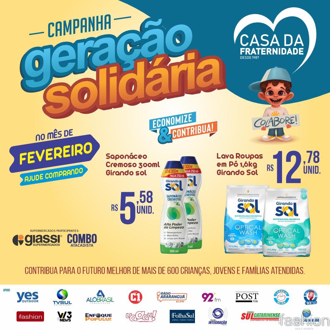 *Saponáceo Cremoso Girando Sol 300ml e Lava Roupas em pó Girando Sol 1.6kg que já estão nas prateleiras de todas as unidades dos Supermercados Giassi e Combo Atacadista do estado. Max, representante da empresa agradeceu a oportunidade de fazer parte da Campanha, que segundo ele, ja é bastante disputada a participação, devido a credibilidade que a entidade vem construindo ao longo dos 36 anos de trabalho. Catia conta que a instituição a cada dia está melhor, hoje são 15 projetos educacionais, culturais e assistenciais realizados para atender as faixas etárias de 6 meses a 24 anos, desde a Creche Meimei até os projetos para jovens. Além das famílias dos atendidos cadastradas que somam-se mais de 1200 pessoas assistidas.