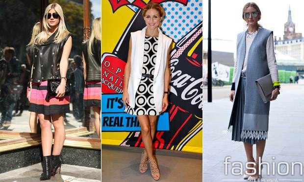 As famosas o combinam com vestido, saia e top de mangas compridas, ou usam fechado na frente, criando um visual mais moderno. A blogueira Lala Rudge apostou no colete de couro da Balmain para quebrar o ar ladylike da saia godê, no terceiro dia de desfiles da temporada parisiense. Já Olivia Palermo elegeu modelos alongados para criar produções superatuais.