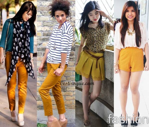 Na moda contemporânea, a atipicidade da mostarda não é mais fator de desordem para com as outras cores. Engana-se quem pensa que a cor mostarda é difícil de combinar, ela é capaz de compor divinos trajes junto ao azul marinho, verde musgo, é uma ótima combinação em composições com peças nas cores burgundy (tonalidades de vinho), marrom e em tons de nude. Ela fica muito bem com tons de azul, inclusive com jeans, use-o a vontade com calças e shorts jeans. Outra dica é usar a cor mostarda com tons pastéis, uma camiseta mostarda combinada a um short creme ou bege, por exemplo, é uma ótima sacada.