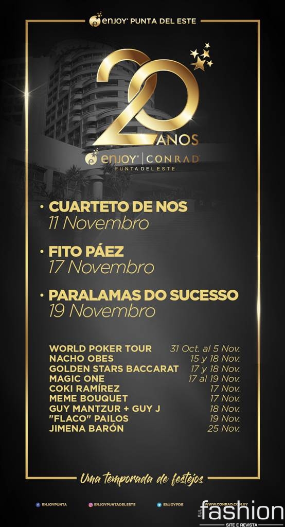 “Estamos orgulhosos de comemorar os vinte anos do Enjoy Conrad, cujo nascimento consolidou Punta del Este como um dos balneários mais importantes do mundo. A chegada do grupo Enjoy, há quatro anos, nos permitiu enriquecer a proposta do resort de alcançar a excelência. É por isso que queremos comemorar este aniversário antecipando o verão com uma agenda artística e eventos internacionais de primeira linha”, diz Javier Azcurra, gerente de Relações Públicas do resort.
