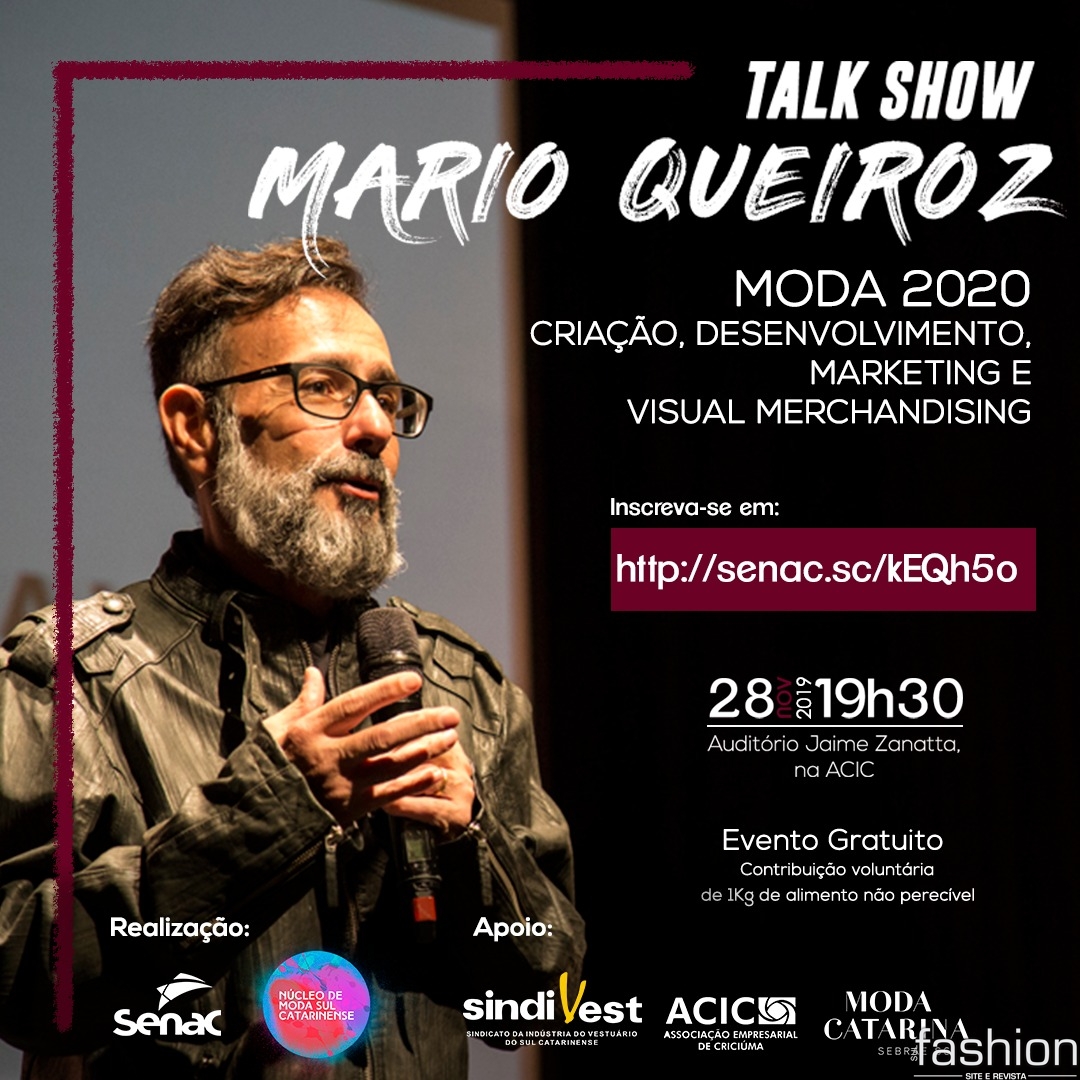 "Acompanho o caminho do Senac em Criciúma com muita admiração e carinho. São muito importantes as possibilidades de crescimento cultural e profissional que tem sido oferecidas. Fico muito feliz em participar deste evento, falar para o mercado, atuar em sala de aula e lançar meu novo livro Homens e Moda no século XXI”, afirma Mario Queiroz.