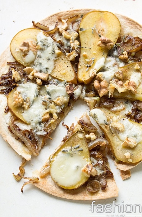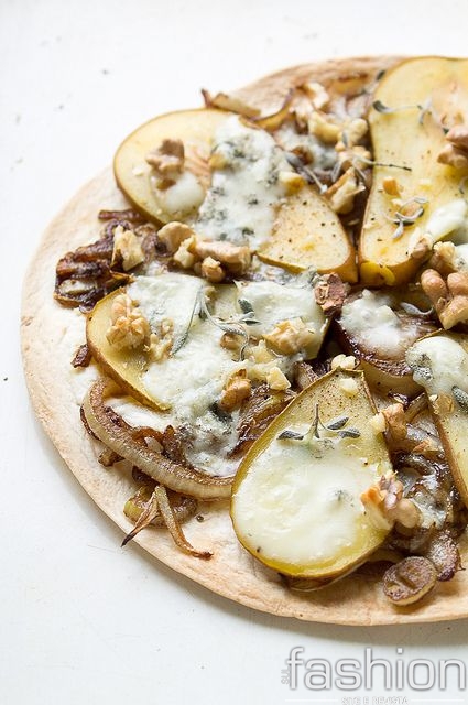 Uma Tortilla Pizza de Pera, Muzzarela de Bufala, Cebola caramelizada e Nozes, que além de diferente fica uma delícia! Confira!
