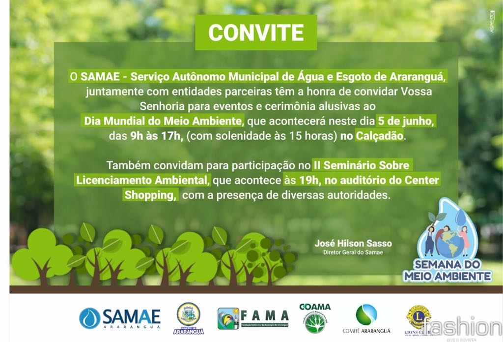 Em continuidade as comemorações da data do Dia Mundial do Meio Ambiente a FAMA, Coama e Samae promovem na noite do dia 5, o 2º Seminário Sobre Licenciamento Ambiental. O evento acontece no auditório Plínio Linhares, no Center Shopping Araranguá, às 19 horas, e a entrada é um quilo de alimento não perecível, que será doado a Casa Lar.