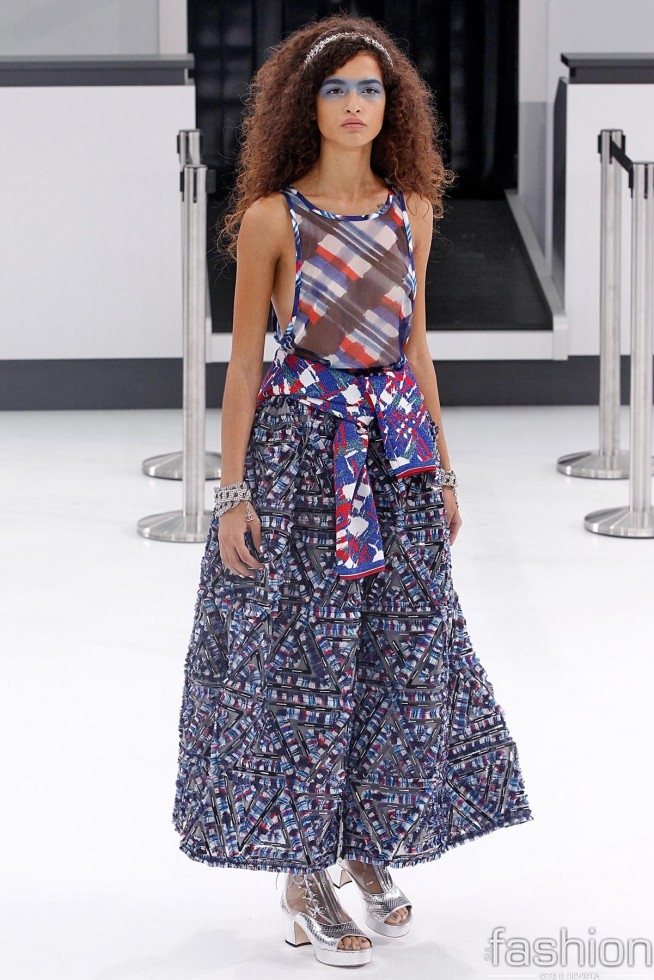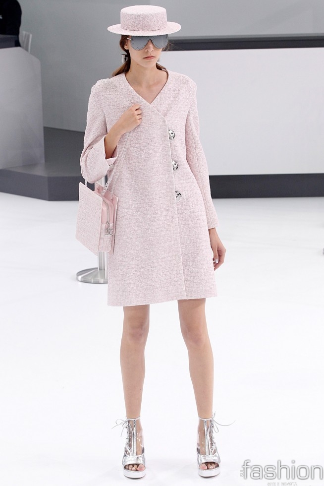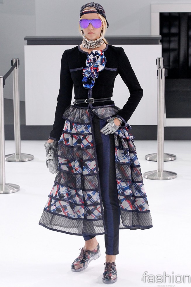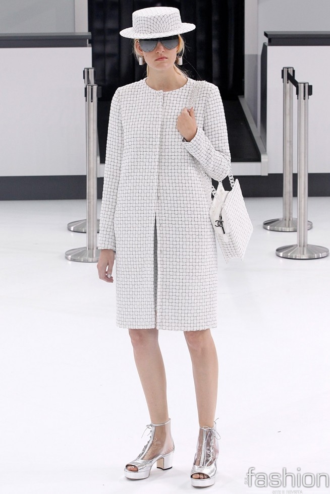 Decolando com Chanel: transformando a passarela num saguão de aeroporto, a Maison se inspirou na aviação para seus looks verão. Variando do clássico tweed a montagens modernas, a grife apostou em calças sobrepostas por saias e uma vestimenta com ar mais rebelde.