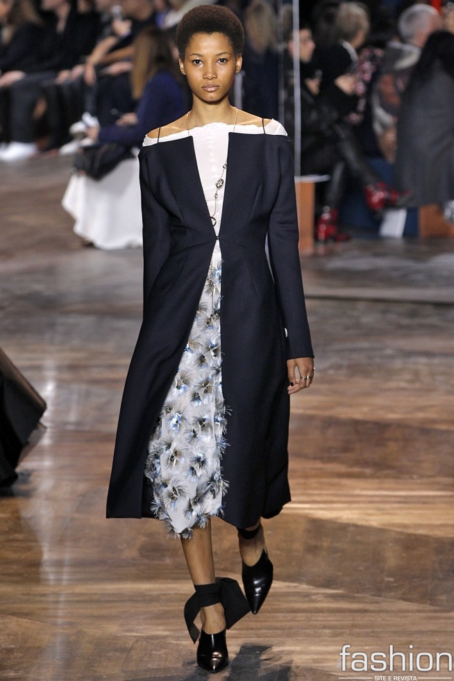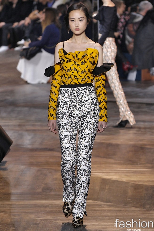 Dior- Serge Ruffieux e Lucie Meier, talentos da própria Maison, tomaram a frente do desfile e apresentaram toques fortes de sobreposição acompanhados do mix de estampas e dos decotes ombro a ombro.