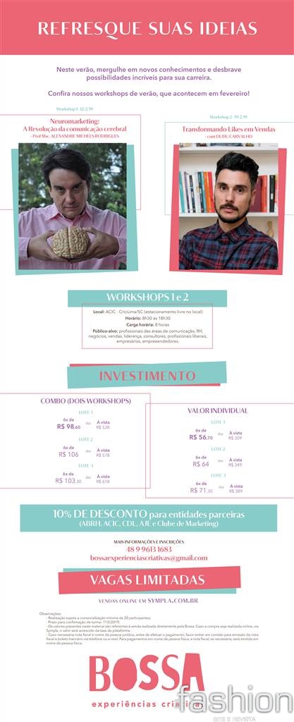 A proposta de realização dos workshops em Criciúma é inspirada nos tradicionais cursos de verão que ocorrem em diversas universidades e escolas superiores, proporcionando ao participante o acesso a informação, em um período em que normalmente pode haver mais disponibilidade. As rotinas de início de ano, podem se constituir um momento mais favorável para o aprendizado antes das demandas acelerarem nas organizações, ressalta a sócia da Bossa Experiências Criativas.