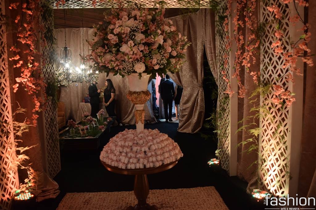 Os salões do Grêmio Fronteira receberam uma ambientação inusitada para o enlace. Das escadarias do clube ao salão nobre, o bom gosto e a originalidade foram destaques. Mais de 3000 metros de tecido jackard rosê foram usados para o revestimento. Na entrada, 3 enormes lustres caíam sobre um lindo jardim verde; no hall, pérgolas brancas e vazadas sustentavam a cascata de flores em tons rose; no salão de apoio, uma tradicional cafeteria foi reproduzida em detalhes pela Rinnovato Painéis Decorativos, empresa da família do noivo, que criou e executou a idealização de JC Lustres e Décor. Pérgolas, Mobília, Paredes totalmente revestidas com Painéis em 3D recortados em mdf com aplicação em pvc, brincavam com a história do casal desenhada pelo pai, Jeremias, proprietário da Rinnovato Painéis. Uma releitura dos jardins e cafés parisienses com o toque moderno dos materiais e da tecnologia.