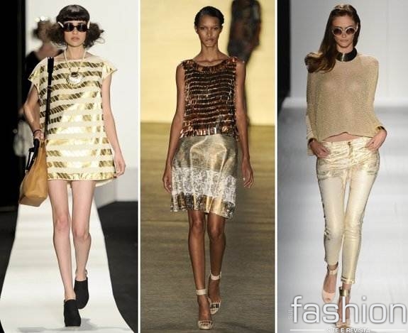Antes cintilaram os glitteres, lantejoulas, paetês, e alguns detalhes metálicos, agora o ponto principal para as novas coleções estão, justamente, nos metalizados, tanto para os tecidos sintéticos, quanto para tons de efeito mais fashion, em dourado, prateado e bronzeado. Estas texturas metálicas, quando em roupas, lembram a tendência do jeans resinado, de efeito de couro, entretanto, para a temporada quente virá com um conceito de estilo megapoderoso, a final, que mulher não quer sair por aí com looks em ouro rosé, sandália com tiras em glitter ouro ou bolsa prateada?