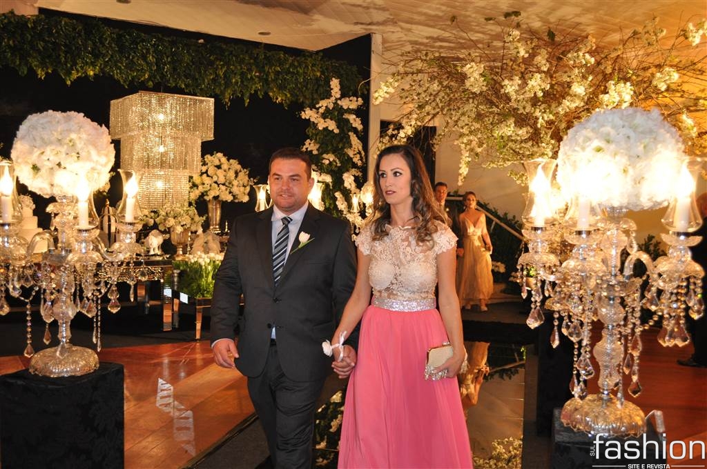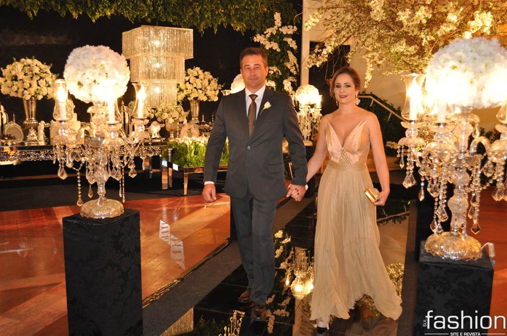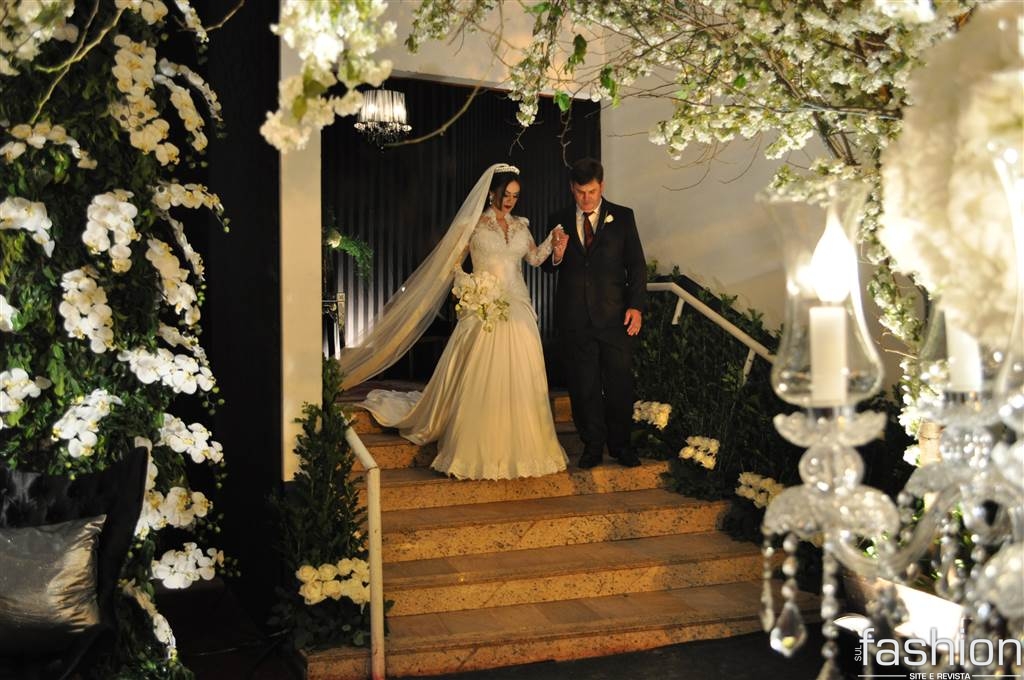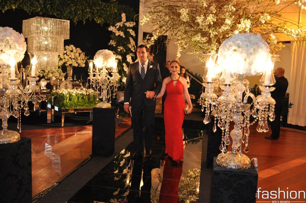 Atravessando a passarela espelhada, sob as luzes dos candelabros de cristais, os padrinhos e o noivo, que foi conduzido alegremente pela mãe até o altar montado dentro do clube, aguardavam a entrada triunfal da noiva, que surgiu na escadaria do salão com belíssimo vestido clássico, assinado por Ludi Aguiar, arrancando suspiros e lágrimas de seu futuro esposo.