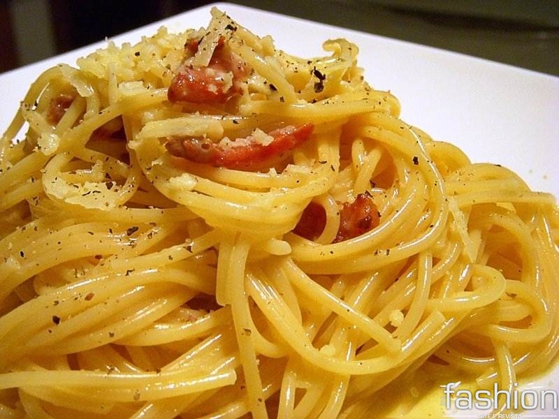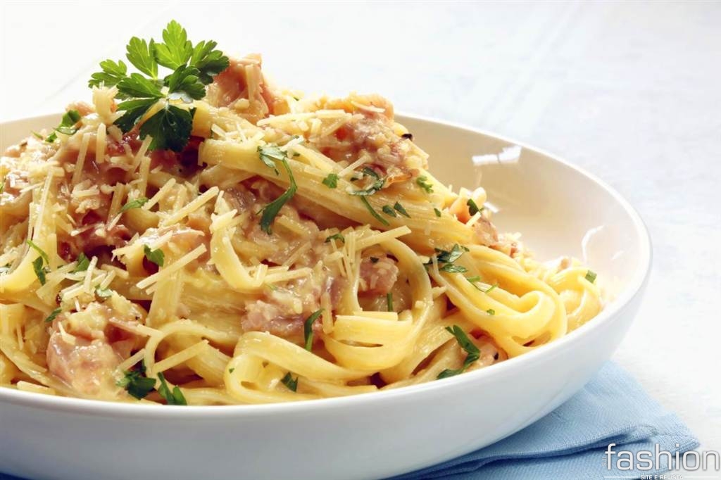 5. Com cuidado, despeje o macarrão cozido em um escorredor. A seguir, transfira o fettuccine para a tigela com a mistura de creme de leite e ovos. Acrescente os cubos de bacon e o refogado de cebola, alho e pimenta e misture muito bem. O calor do macarrão irá cozinhar o molho.