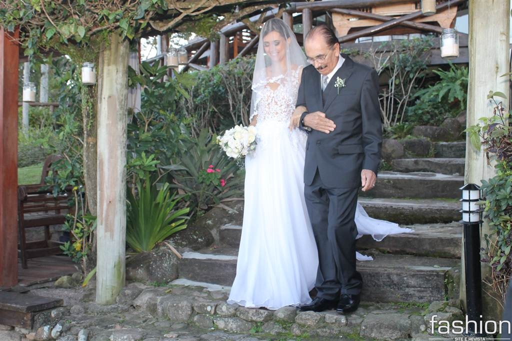 Já iniciava o pôr do sol, do dia 23 de maio, quando a linda noiva, Leila Ramos, surgia no alto da escada do Ecoresort &Beach Village Vida, Sol e Mar. Conduzida pelo pai Sebastião Ramos, ela, produzida por Fernanda Fernandes e com vestido by Melissa Thiesen, caminhou em direção ao noivo, Alexei Ramm, que, ansioso, a esperava amparado pelas belezas naturais da Praia do Rosa.
