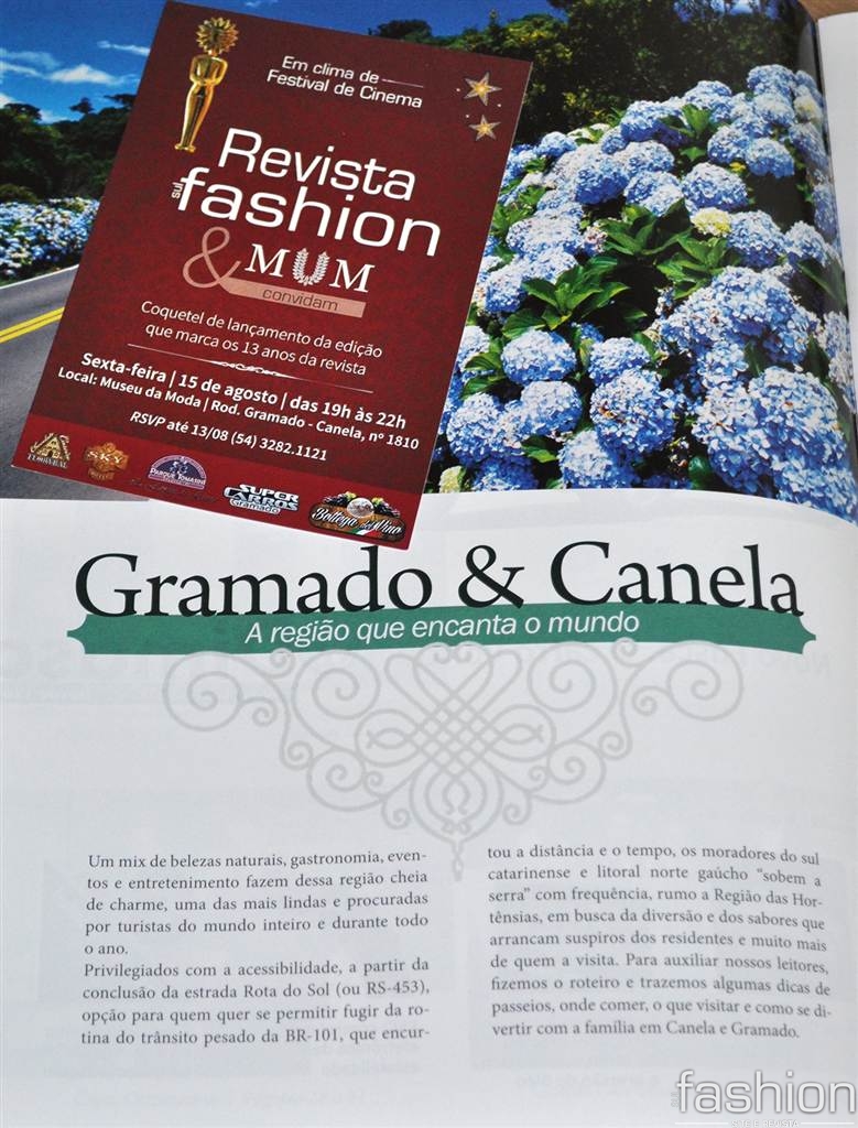 Em clima de cinema, a Sul Fashion faz o lançamento oficial da 46ª edição, que marca os 13 anos da revista, na cidade de Gramado-RS. Em parceria com o MUM - Museu da Moda, o coquetel para seletos convidados na sexta-feira, 15 de agosto, contará com a presença de artistas e cineastas presentes no Festival de Cinema de Gramado.
