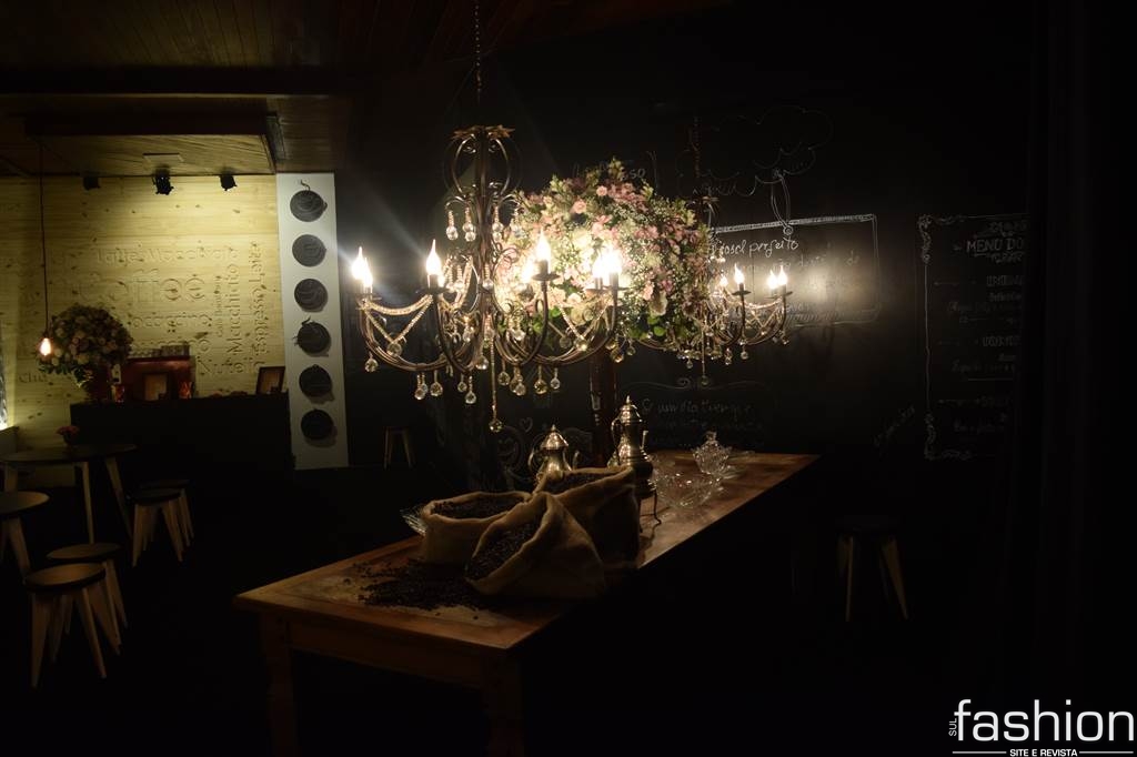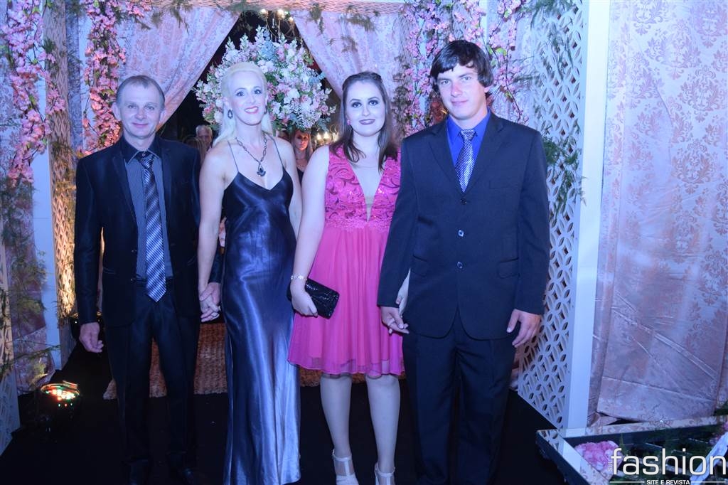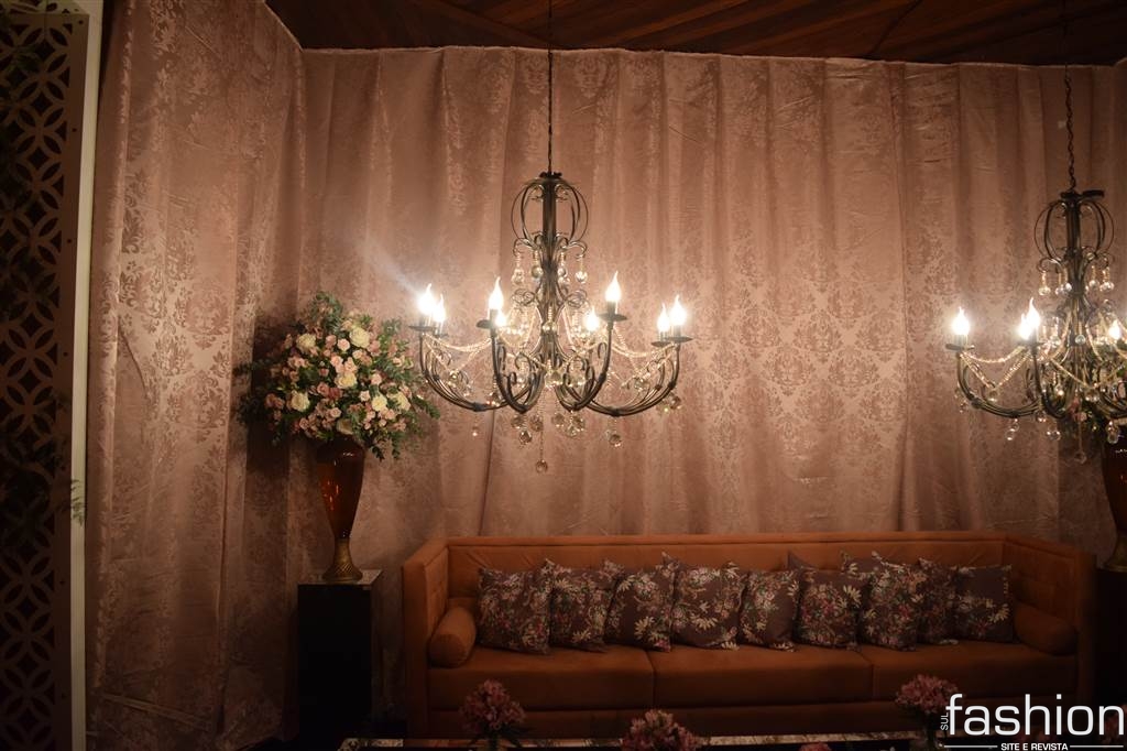 Os salões do Grêmio Fronteira receberam uma ambientação inusitada para o enlace. Das escadarias do clube ao salão nobre, o bom gosto e a originalidade foram destaques. Mais de 3000 metros de tecido jackard rosê foram usados para o revestimento. Na entrada, 3 enormes lustres caíam sobre um lindo jardim verde; no hall, pérgolas brancas e vazadas sustentavam a cascata de flores em tons rose; no salão de apoio, uma tradicional cafeteria foi reproduzida em detalhes pela Rinnovato Painéis Decorativos, empresa da família do noivo, que criou e executou a idealização de JC Lustres e Décor. Pérgolas, Mobília, Paredes totalmente revestidas com Painéis em 3D recortados em mdf com aplicação em pvc, brincavam com a história do casal desenhada pelo pai, Jeremias, proprietário da Rinnovato Painéis. Uma releitura dos jardins e cafés parisienses com o toque moderno dos materiais e da tecnologia.