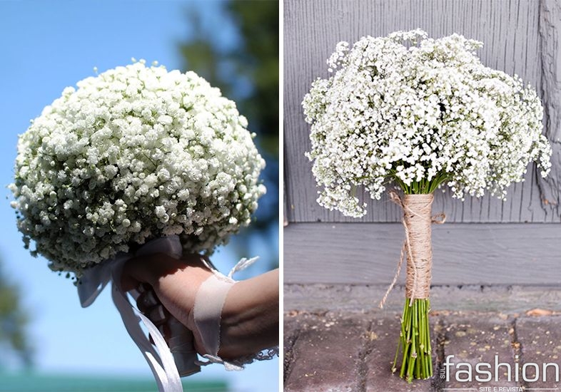 Flores miúdas, como mosquitinhos, sempre-vivas e chuva de prata não precisam, necessariamente, ser coadjuvantes no buquê da noiva. Usadas em grandes quantidades elas podem compor arranjos lindos. "Este tipo de buquê combina bem com cerimônias diurnas e campestres. O vestido da noiva não pode ter brilho e deve ser leve, sem volume. Para dar mais cor ao acessório vale usar uma fita no cabo", aconselha a especialista.
