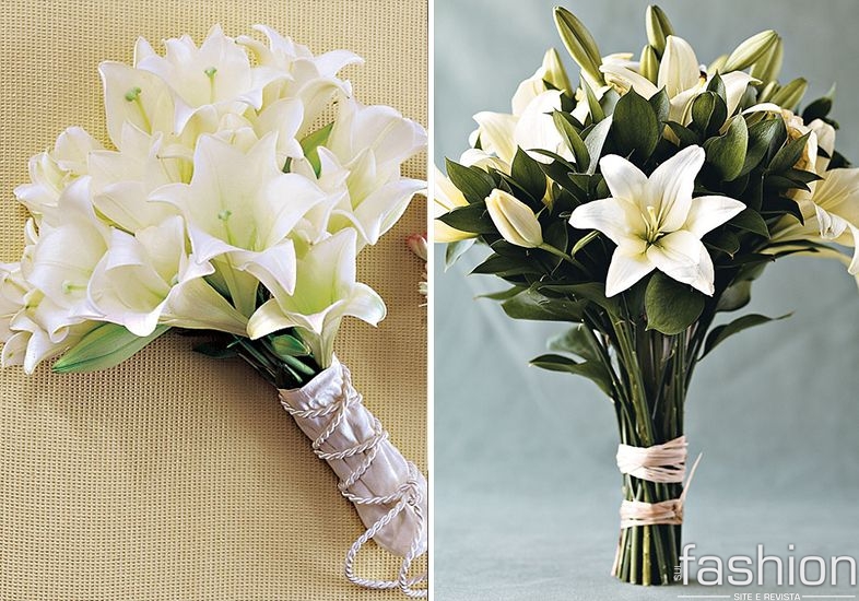 Quando pensamos em buquê branco, os lírios e copos de leite logo vêm à mente. Isto porque estas flores se tornaram as mais usadas por noivas no mundo todo graças à sua delicadeza na forma e no aroma. "Muitas noivas optam por buquês grandiosos, com muitas flores. Outras preferem entrar com apenas um copo de leite ou lírio na mão. A escolha é muito pessoal, mas em ambos os casos o efeito é encantador. Elas combinam perfeitamente com todo tipo de cerimônia", conta Edna.