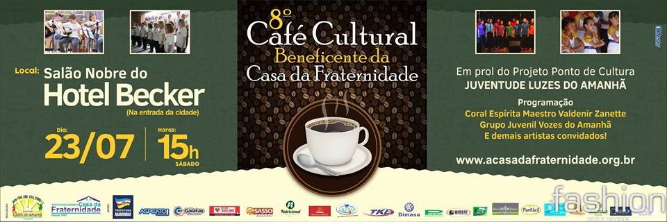 A Casa da Fraternidade convida a todos para o 8º Café Cultural Beneficente, em prol do Projeto Ponto de Cultura Juventude Luzes do Amanhã, projeto que atende 250 crianças. O evento contará com as apresentações dos alunos das Oficinas do Projeto como, Balé, Capoeira, Violão e Canto Coral, e com a participação especial do Coral Espírita Maestro Valdenir Zanette de Criciúma. Durante as apresentações, será servido um coquetel de doces e salgados.