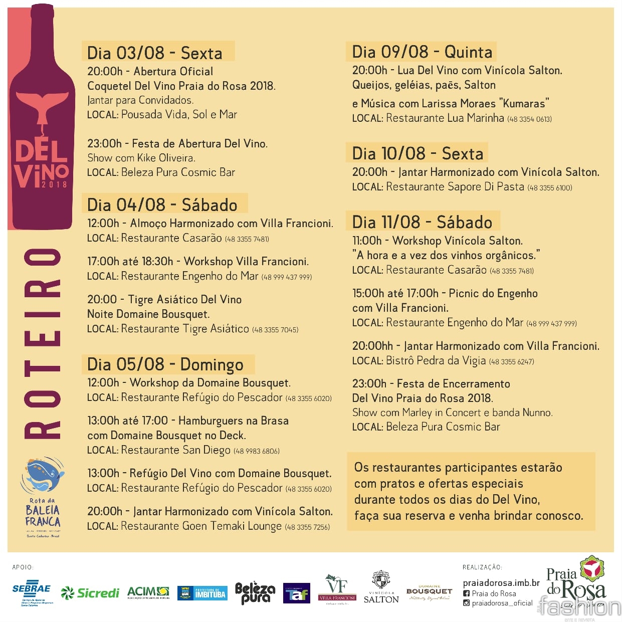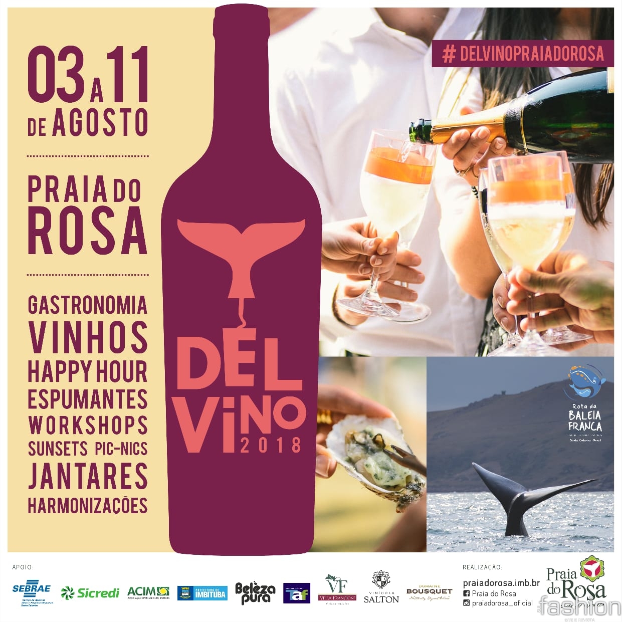 Tendo como plano de fundo as belezas naturais da Praia do Rosa – considerada uma das 30 baías mais belas do mundo, o Del Vino é uma iniciativa da Associação Empresarial de Imbituba (ACIM) – Núcleo Praia do Rosa em parceria com o Sebrae/SC e a Prefeitura de Imbituba, a fim de promover o turismo de Inverno na região. A programação terá jantares, pic-nics, passeios, happy hour, palestras e workshops, como explica uma das organizadoras do evento, Eloisa Litman, proprietária do restaurante Engenho do Mar.