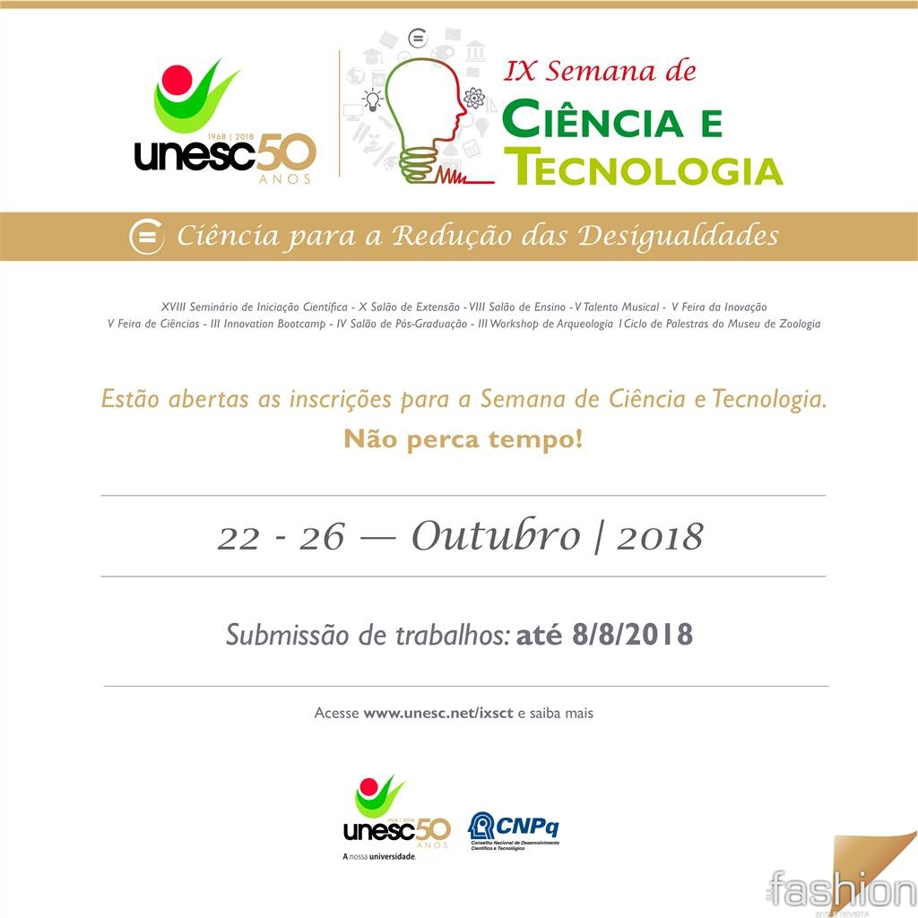 A nona edição da Semana de ciência e Tecnologia da Unesc se aproxima, este ano com o tema “Ciência para a Redução das Desigualdades”. O encontro, que ocorre entre 22 e 26 de outubro está com inscrições de trabalhos abertas, basta entrar no seite da Unesc.