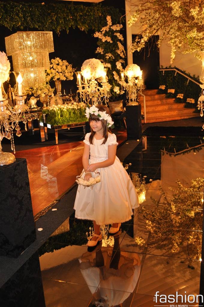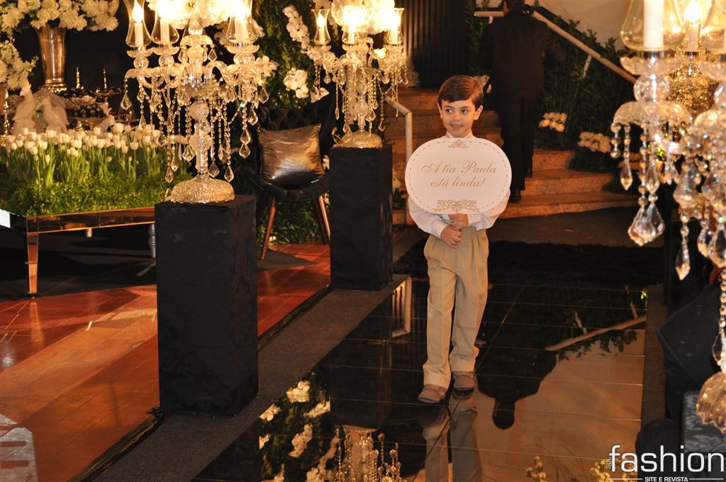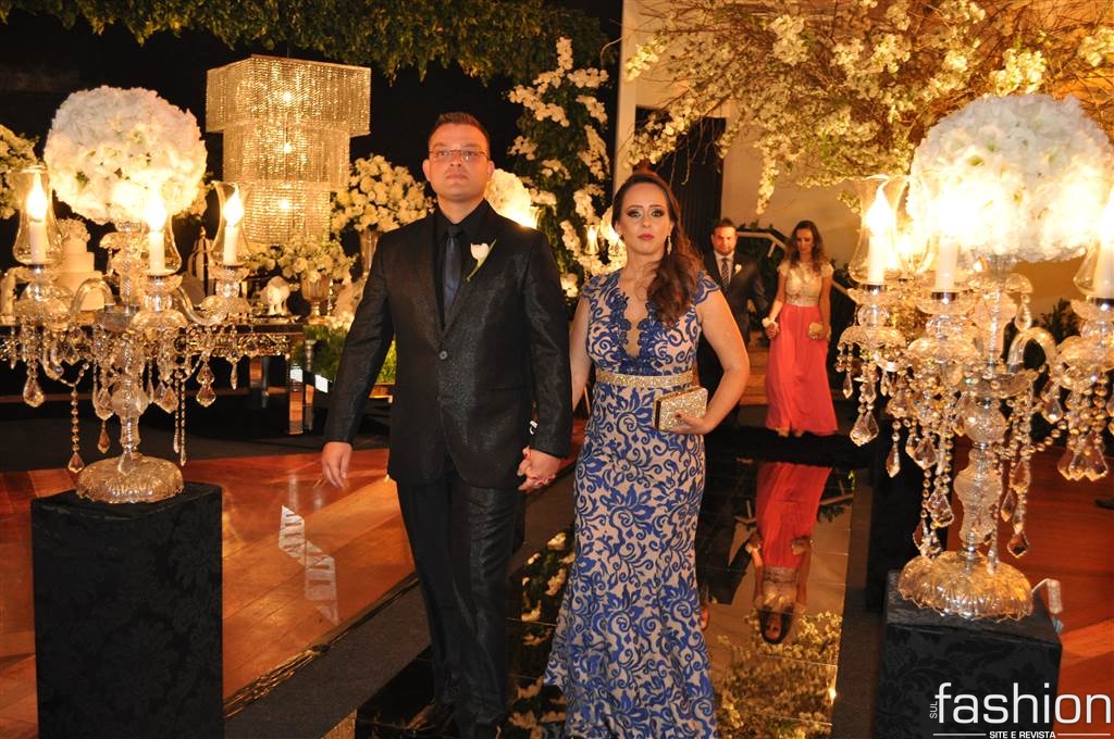 Atravessando a passarela espelhada, sob as luzes dos candelabros de cristais, os padrinhos e o noivo, que foi conduzido alegremente pela mãe até o altar montado dentro do clube, aguardavam a entrada triunfal da noiva, que surgiu na escadaria do salão com belíssimo vestido clássico, assinado por Ludi Aguiar, arrancando suspiros e lágrimas de seu futuro esposo.