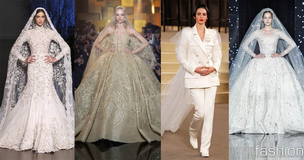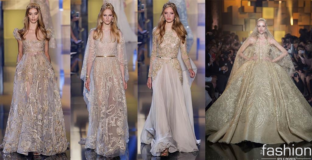 O estilista libanês Elie Saab apostou em modelos românticos que lembram a época medieval, usando detalhes de transparências e pedraria. Para a moda wedding, ele arrancou suspiros com o modelo clássico e volumoso da noiva dourada.