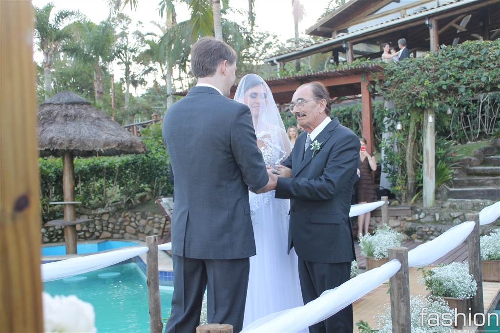 Com detalhes milimetricamente acertados, desde a troca de alianças até o beijo apaixonado após as juras de amor eterno, a cerimônia arrancou suspiros de todos. Após selarem matrimônio, os noivos, vibrando de alegria, acompanharam os convidados até o salão de festa, onde um delicioso buffet os aguardava.
